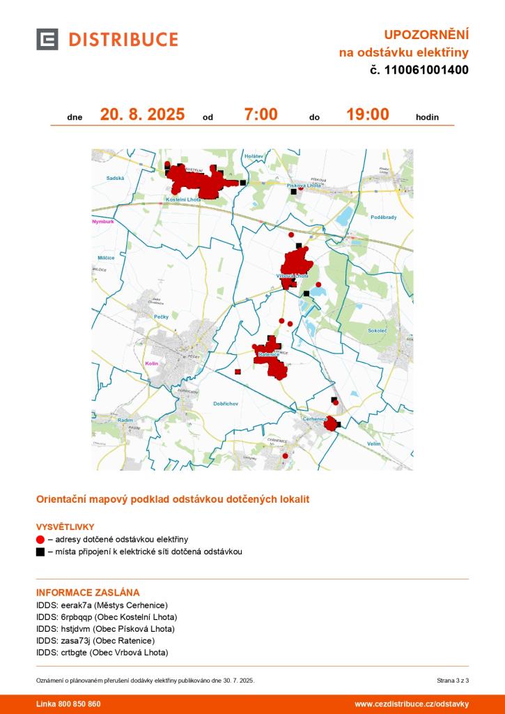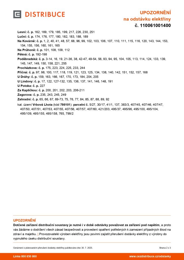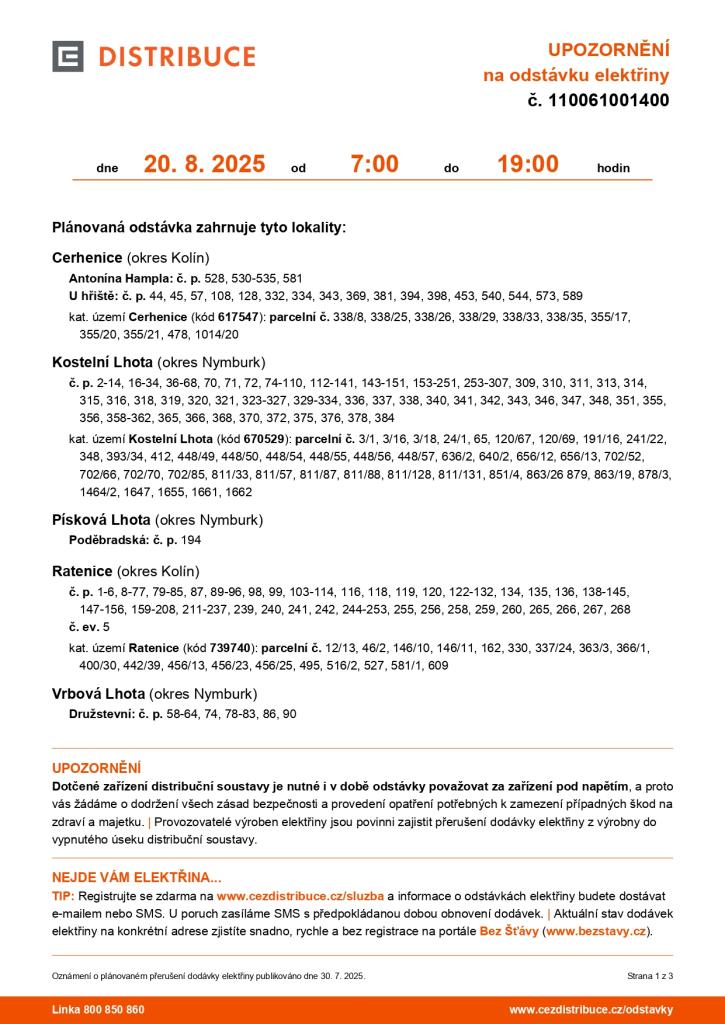 ČEZ Distribuce oznamuje, že dne 20.8.2025 plánuje v obci odstávku elektřiny od 7:00 do 19:00. Viz. příloha.